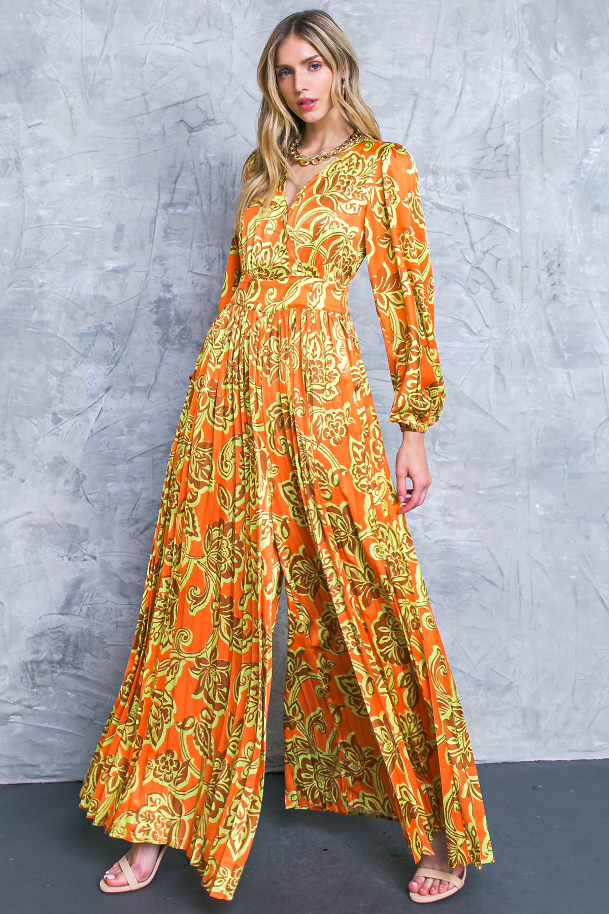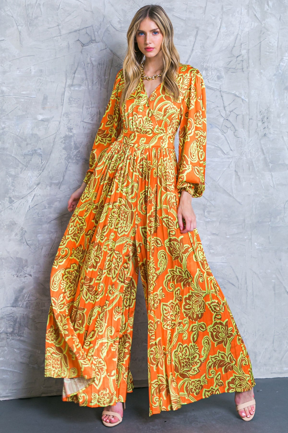 Embrace effortless elegance with the Blushing With Brilliance Satin Jumpsuit, a truly captivating addition to your wardrobe. ✨ This jumpsuit features a luxurious satin finish that drapes beautifully, complemented by a sophisticated surplice neckline and chic pleated wide-leg pants for a touch of timeless grace. Designed for comfort and style, it boasts elegant long puff sleeves and a practical side zipper closure, ensuring a flattering silhouette for any occasion. Step out in confidence and radiance in this stunning Flying Tomato piece. 🌸