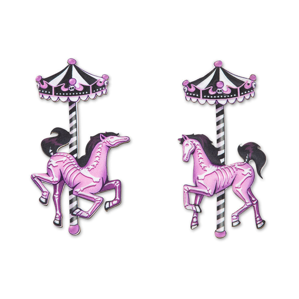 Step into a world of whimsical wonder with the Chocolaticas Spectral Ride Mary Jane Flat, featuring a luxurious black velvet upper adorned with a striking carousel design. Skeletal pink horses and bold purple details bring this enchanting design to life, making each step a statement of unique style. 🌸 A single strap with a matching purple buckle ensures a secure and comfortable fit, while the cushioned inner sole provides blissful comfort for all-day wear. Grounded by a non-marking rubber sole, these flats are perfect for everyday adventures. ✨