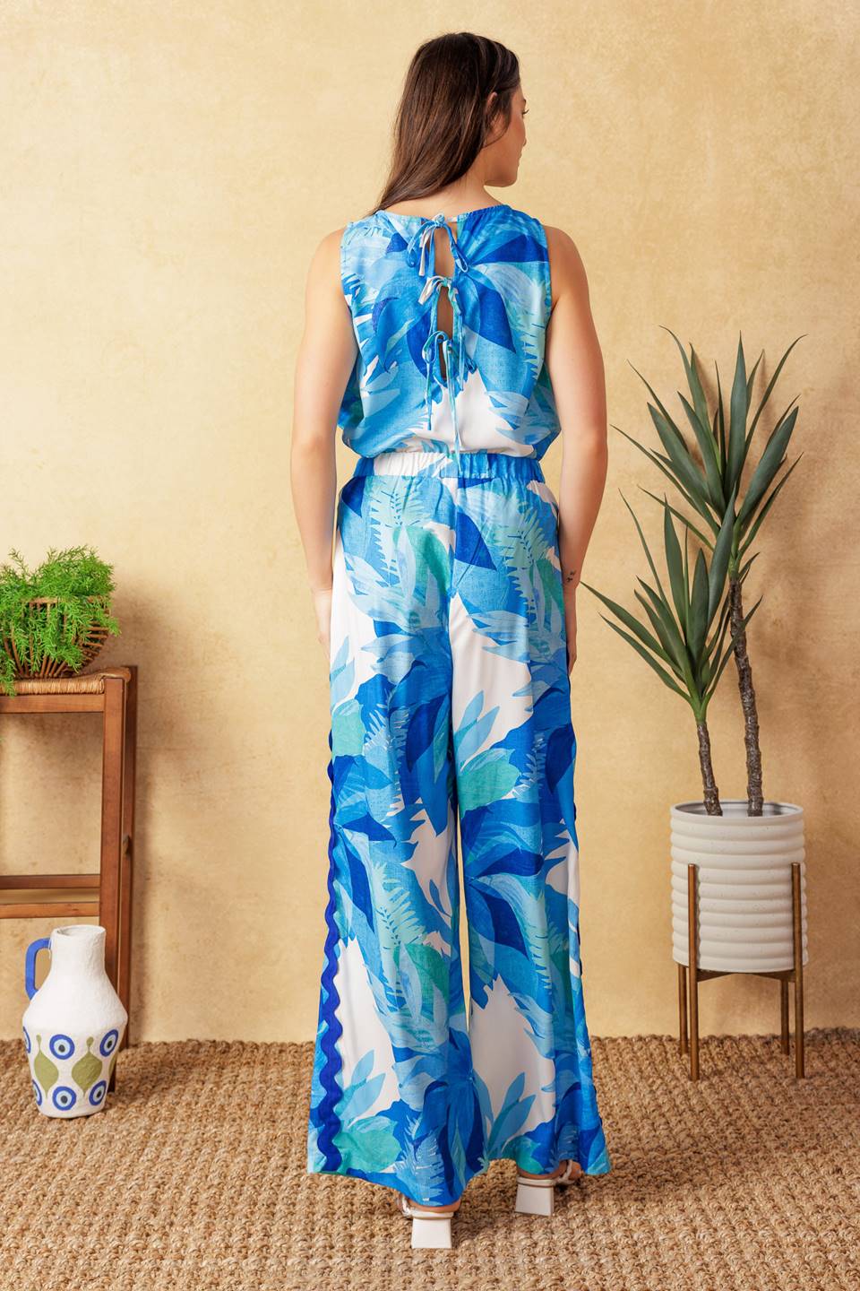 A printed woven top featuring a round neckline, sleeveless, ric rac ribbon detailed hemline and tie back. Matching pant DAYS GO BY WOVEN PANTS