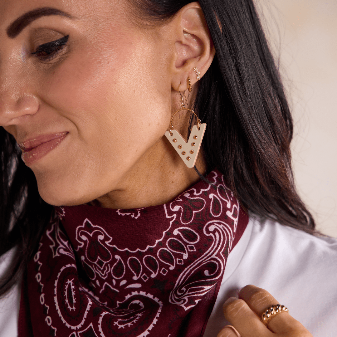 Make a captivating statement with the Ecru Studded Sutton leather earrings, a perfect blend of modern style and artisanal craftsmanship. ✨ Each earring features a unique geometric shape, beautifully adorned with individually hand-applied gold or silver studs that catch the light with every movement. These lightweight treasures offer effortless elegance, adding a touch of sophisticated shimmer to your free-spirited look. 🌿
