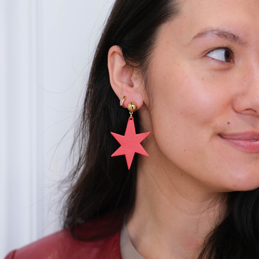 Adorn yourself with the striking Ginger Red Astrid earrings, crafted from premium Italian leather into a captivating star shape. ✨ Each earring is finished with a polished gold or silver post stud, offering a touch of radiant elegance. These beauties provide a bold statement look with an incredibly lightweight feel, perfect for comfortable all-day wear. Let your free-spirited style shine through with this unique and artisanal accessory! 💫