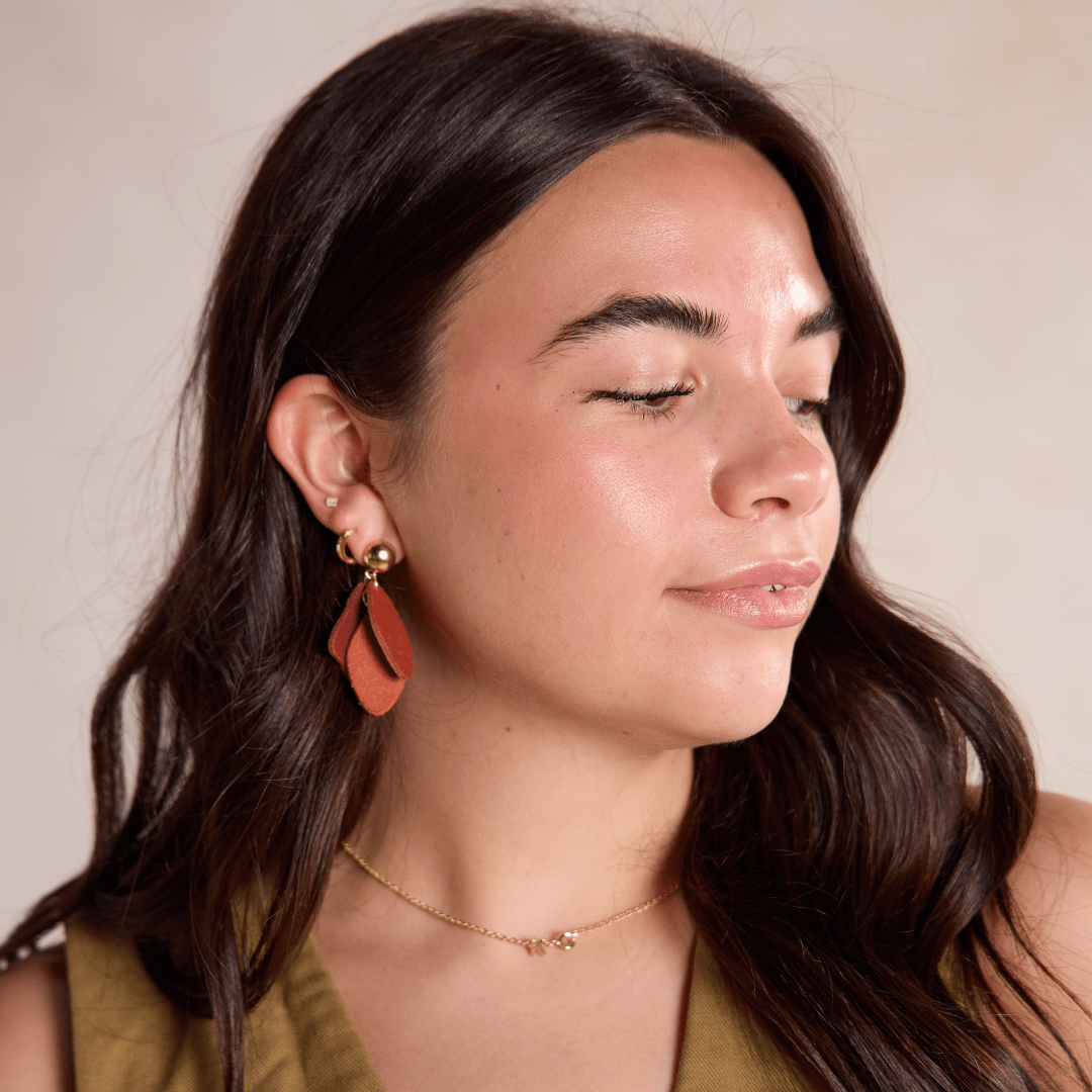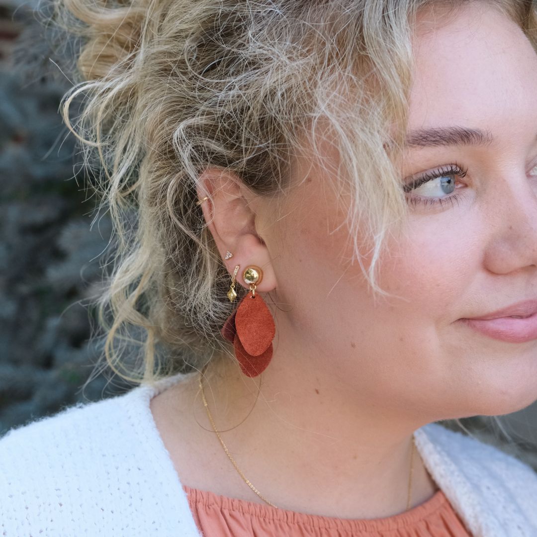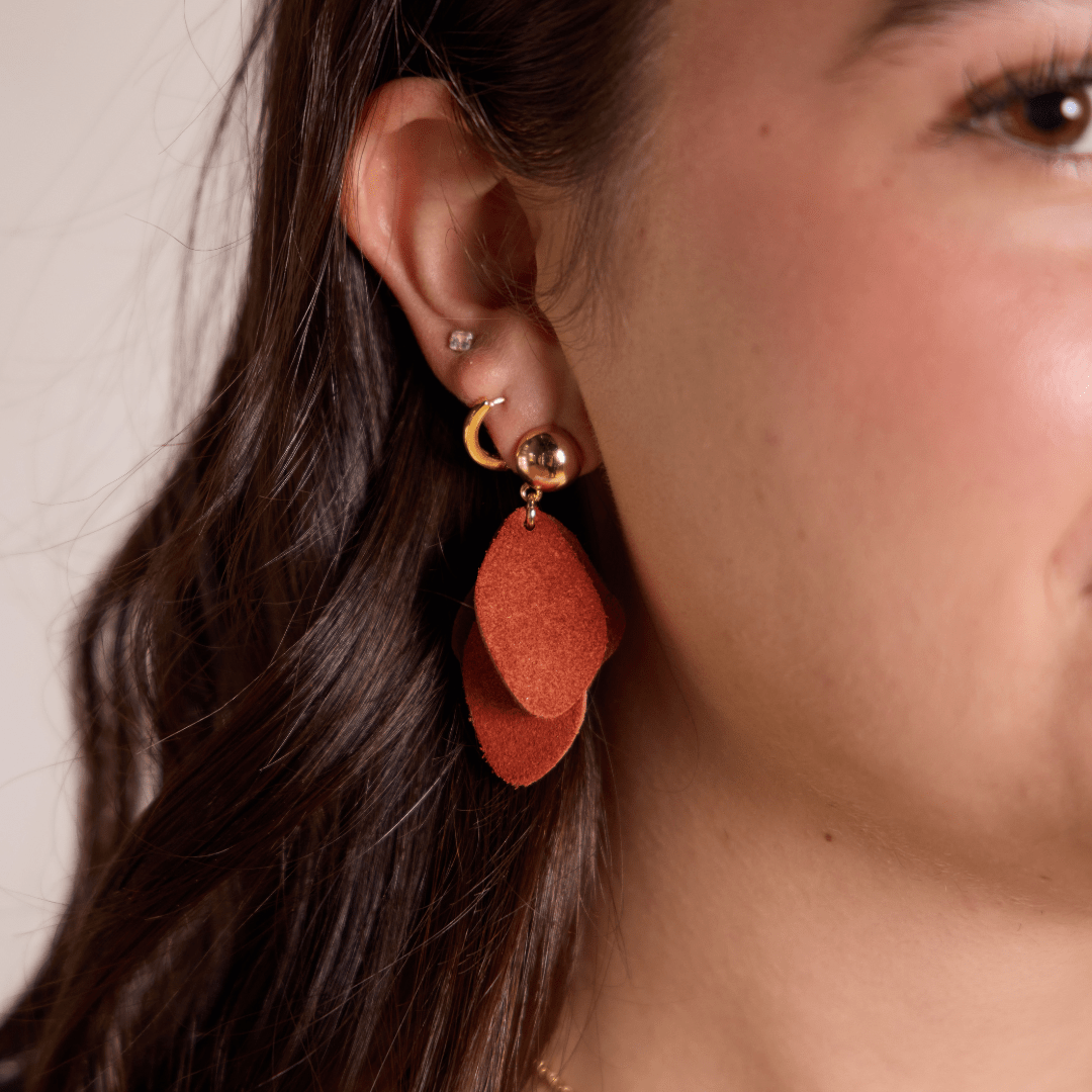 Elevate your look with the Weston earrings, a fresh interpretation of classic leather earrings. ✨ These unique statement studs are crafted from sumptuous ginger suede leather, offering subtle movement and a wonderfully lightweight design that you'll adore. Adorned with either a gold or silver stud piece, the Weston earrings bring a touch of free-spirited charm to any outfit. Their one-of-a-kind appeal and comfortable fit make them perfect for effortless, bohemian-inspired elegance. 🌿💫
