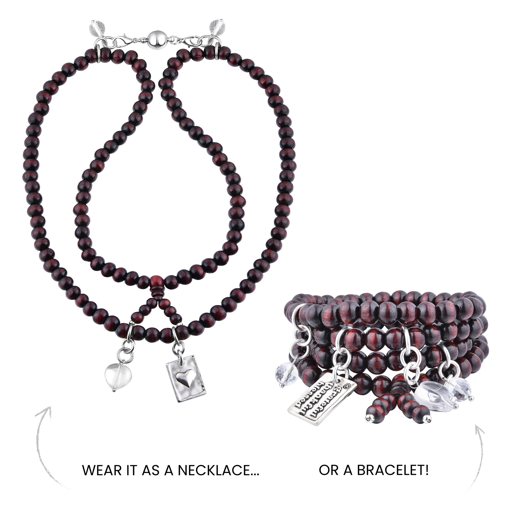 Embrace a spirit of gratitude with this beautiful Katia Designs Grateful Thankful Blessed Heart Wood Boho Wrap Bracelet/Necklace. ✨ Crafted with warm red wooden beads, this versatile piece features a silver-finished pendant inscribed with "Grateful Thankful Blessed," elegantly paired with a sparkling crystal quartz heart and additional crystal quartz accents for a gentle, loving energy. 💖 This adjustable design can be worn as a chic wrap bracelet or a delicate necklace, securing easily with its magnetic clasp. Choose from two sizes for this perfect accessory, adding a touch of bohemian charm and a reminder of life's blessings. 🌿