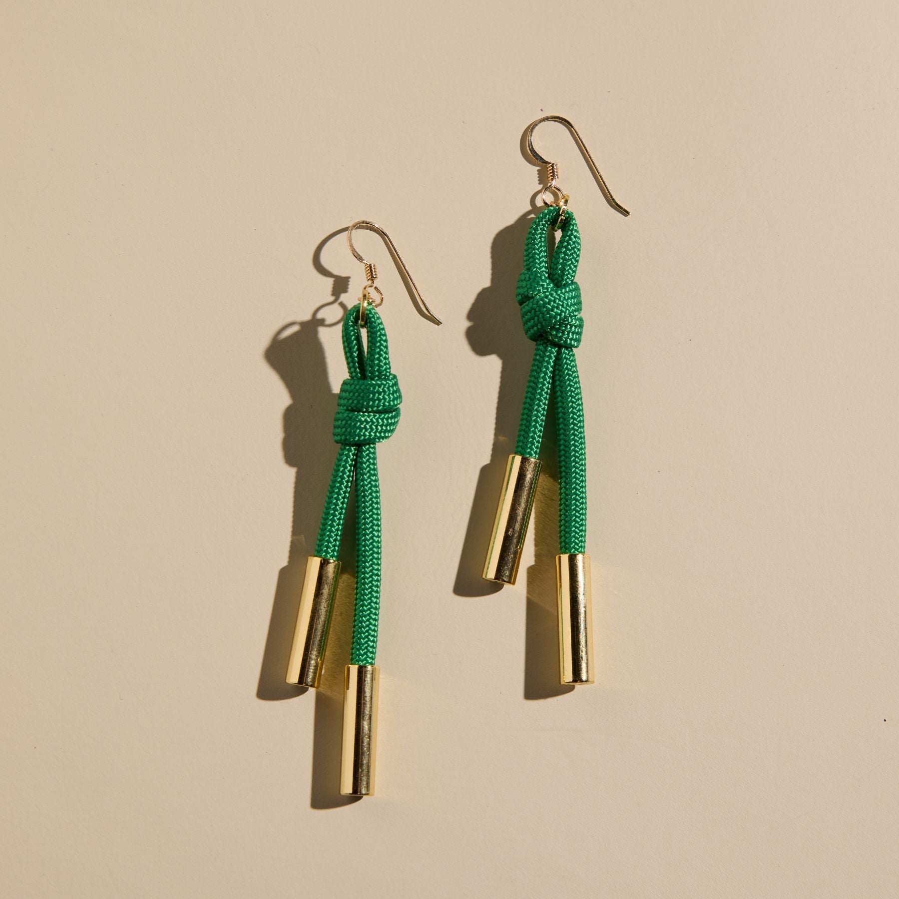 Elevate your everyday style with our radiant Green Denver Cord Earring, a truly unique statement piece. ✨ These lightweight earrings are meticulously crafted from vibrant nylon paracord, gracefully suspended from your choice of 14k gold-filled or rhodium-plated sterling silver hooks for a touch of refined sparkle. Perfect for adding a pop of color to any outfit, they're designed to be your go-to accessory, whether you're off on an adventure or heading to a special event. 🌿