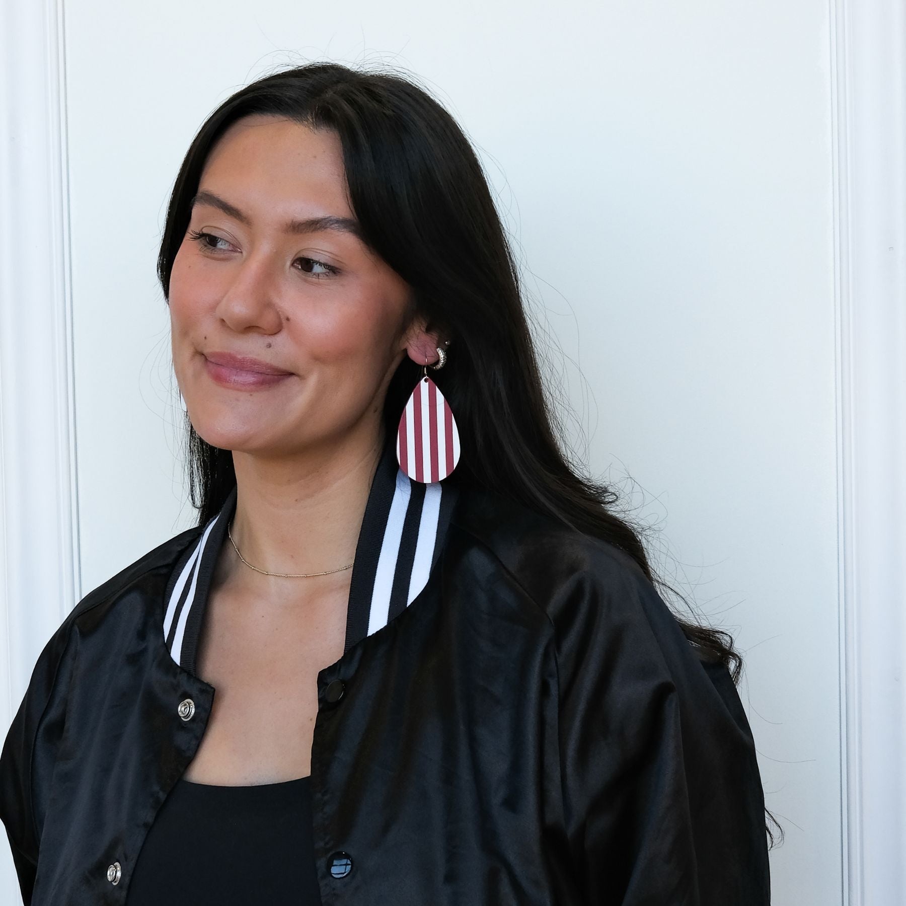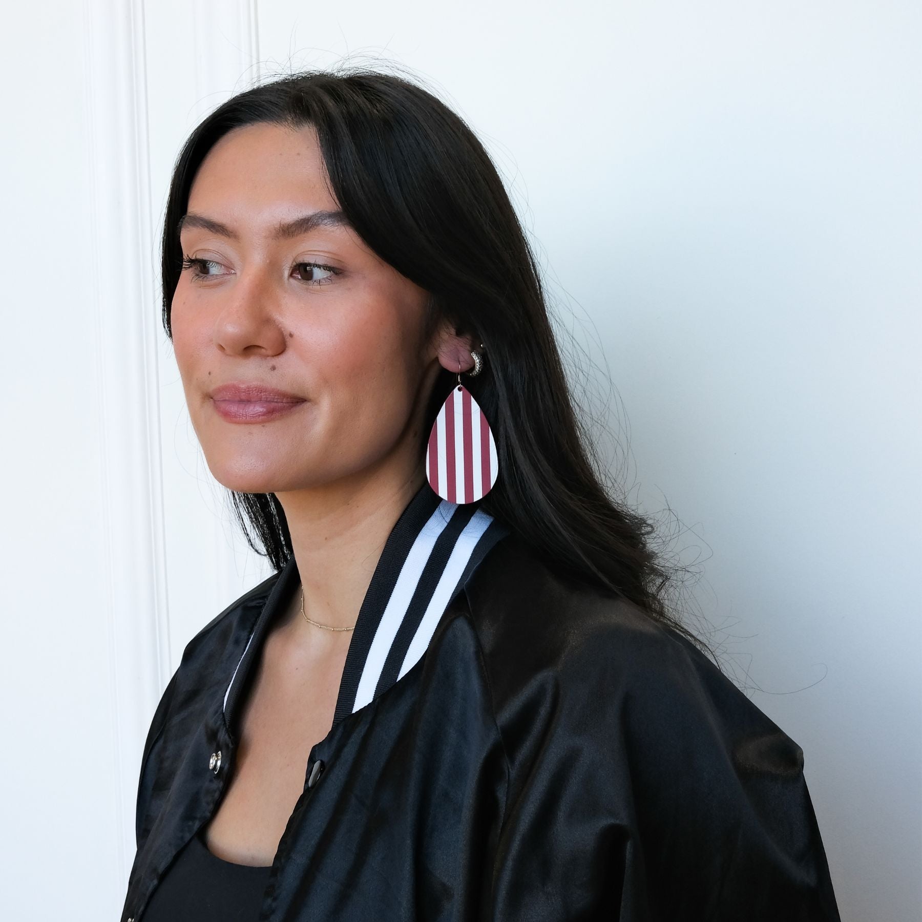 Add a spirited touch to your look with Hoosier Stripe Teardrops, handcrafted from premium cardinal leather. These stunning earrings feature sleek white hand-stamped stripes, designed with an Indiana University flair. Available on your choice of gold or silver hardware, these lightweight teardrops offer a playful pop of color perfect for game day or any casual outing. 🐾✨