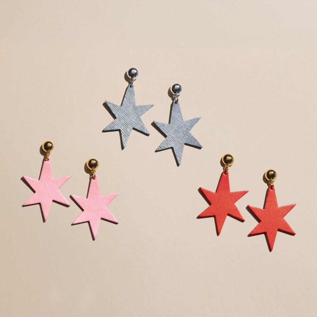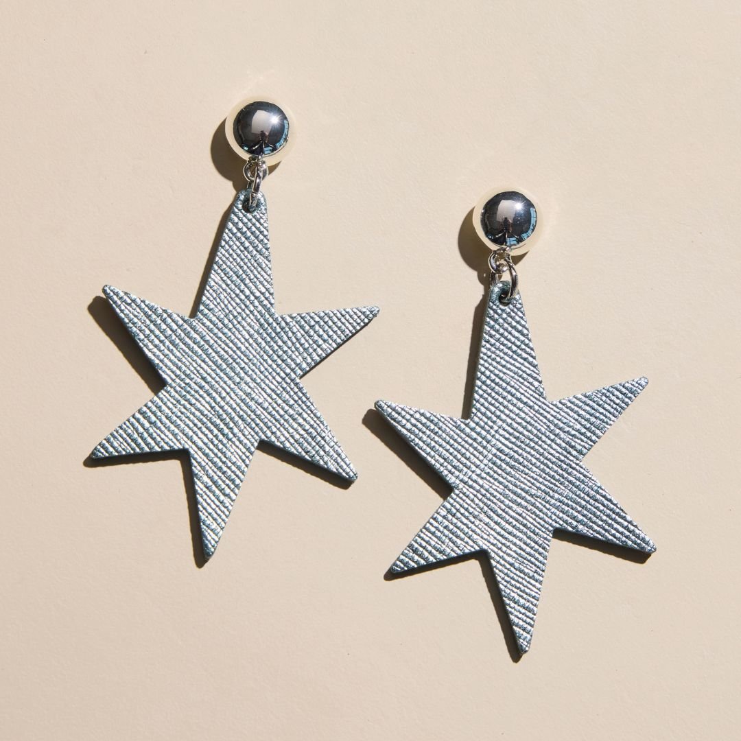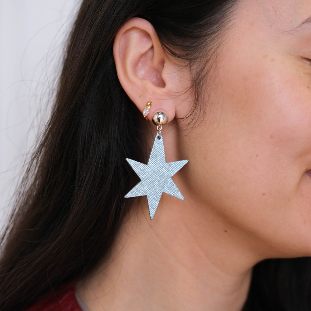 Embrace celestial charm with the Ice Blue Astrid earrings, where artistic design meets effortless wear. 🌠These stunning star-shaped earrings are meticulously crafted from premium Italian leather, offering a luxurious feel that is surprisingly lightweight. ✨ Each pair is finished with a polished silver post stud, ensuring both comfort and a touch of radiant elegance for your everyday adventures or special occasions.