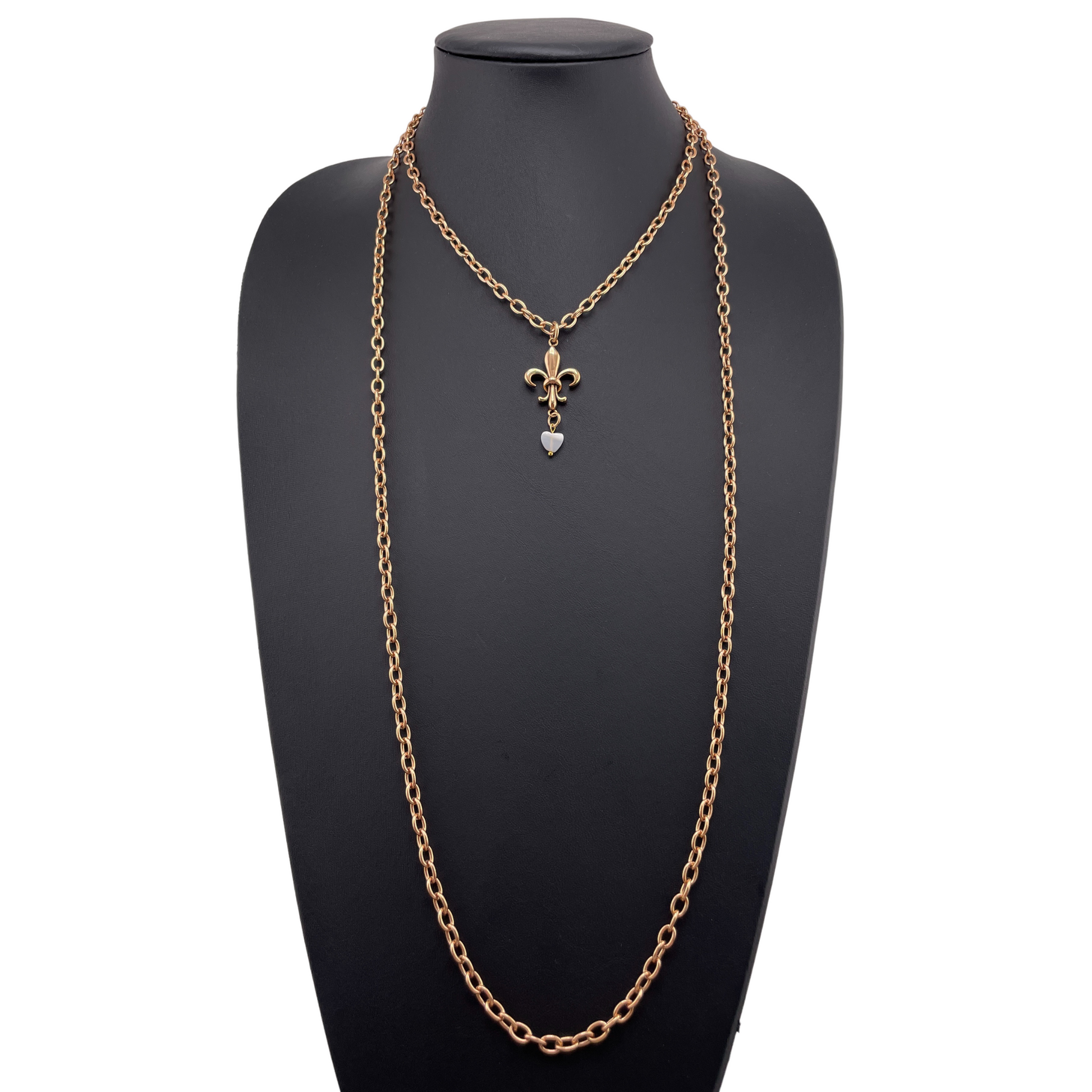 Drape yourself in timeless elegance with the "Love Fleur-de-Lis Essential Necklace" from Katia Designs. ✨ This captivating piece features a delicate Fleur-de-Lis pendant, symbolizing purity and light, beautifully accented by an 8mm pearl heart. Crafted with a 48-inch, 7mm plated brass chain, its essential design and magnetic clasp closure offer both comfort and grace. 💖