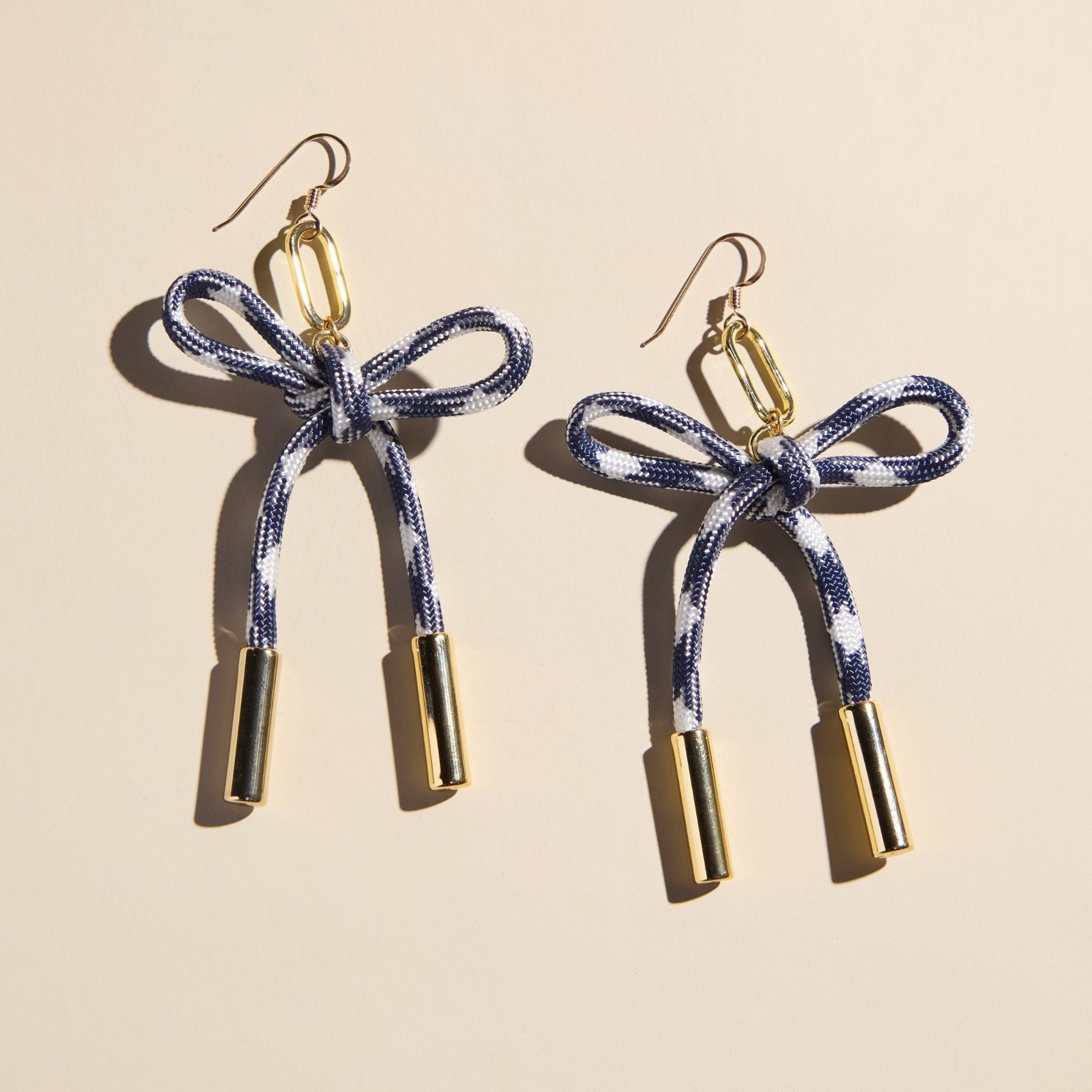 Dive into effortless style with our Navy & White Simone Cord Earring, a beautiful nautical update to our beloved cord designs. ⚓️ Crafted from durable nylon paracord, these lightweight statement earrings offer a crisp, classic touch perfect for any adventure. They feature your choice of luxurious 14k gold-filled or rhodium-plated sterling silver hooks, ensuring both comfort and elegance for summer getaways, spirited game days, or simply elevating your everyday look. ✨
