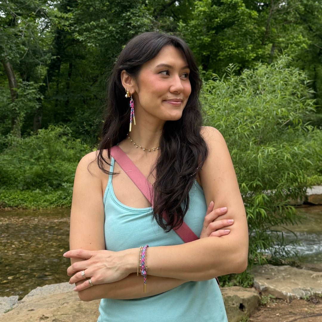 Embrace conscious living with the vibrant Pink & Blue Denver Cord Earring, a lightweight statement piece designed for effortless accessorizing ✨. Crafted from durable nylon paracord, these unique earrings feature hooks made from either luxurious 14k gold-filled or sleek rhodium-plated sterling silver, ensuring both beauty and comfort for your everyday adventures 🌸. These artisan earrings offer a playful pop of color wherever you go, perfect for adding a touch of personality to any ensemble 🌿.