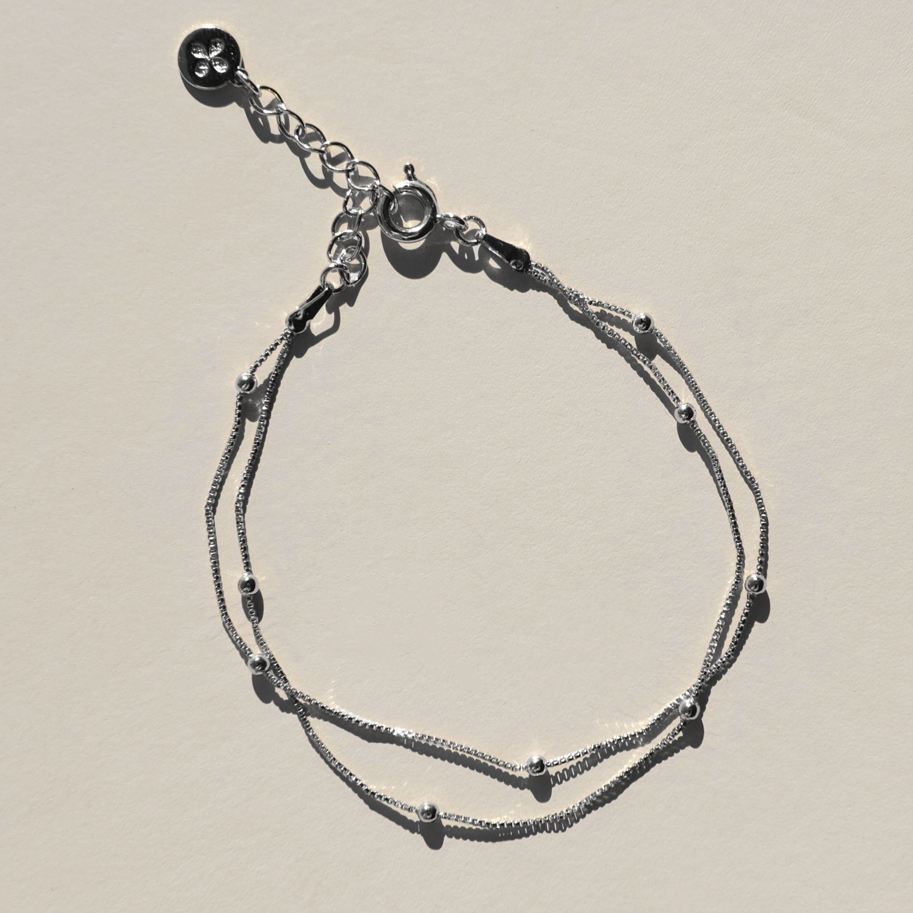 Stack up your wrist in effortless style with our Silver Double Layer Saturn Chain Bracelet. ✨ This minimalist's dream features a beautiful double-layer Saturn chain, crafted for a delicate and sophisticated look perfect for everyday wear or special occasions. Designed with a convenient chain extender and secure clasp, it offers an adjustable length to ensure your perfect fit every time. This stunning bracelet is PVD plated for exceptional durability and waterproof qualities, allowing you to embrace conscious living without compromising on functionality. 🌿💫