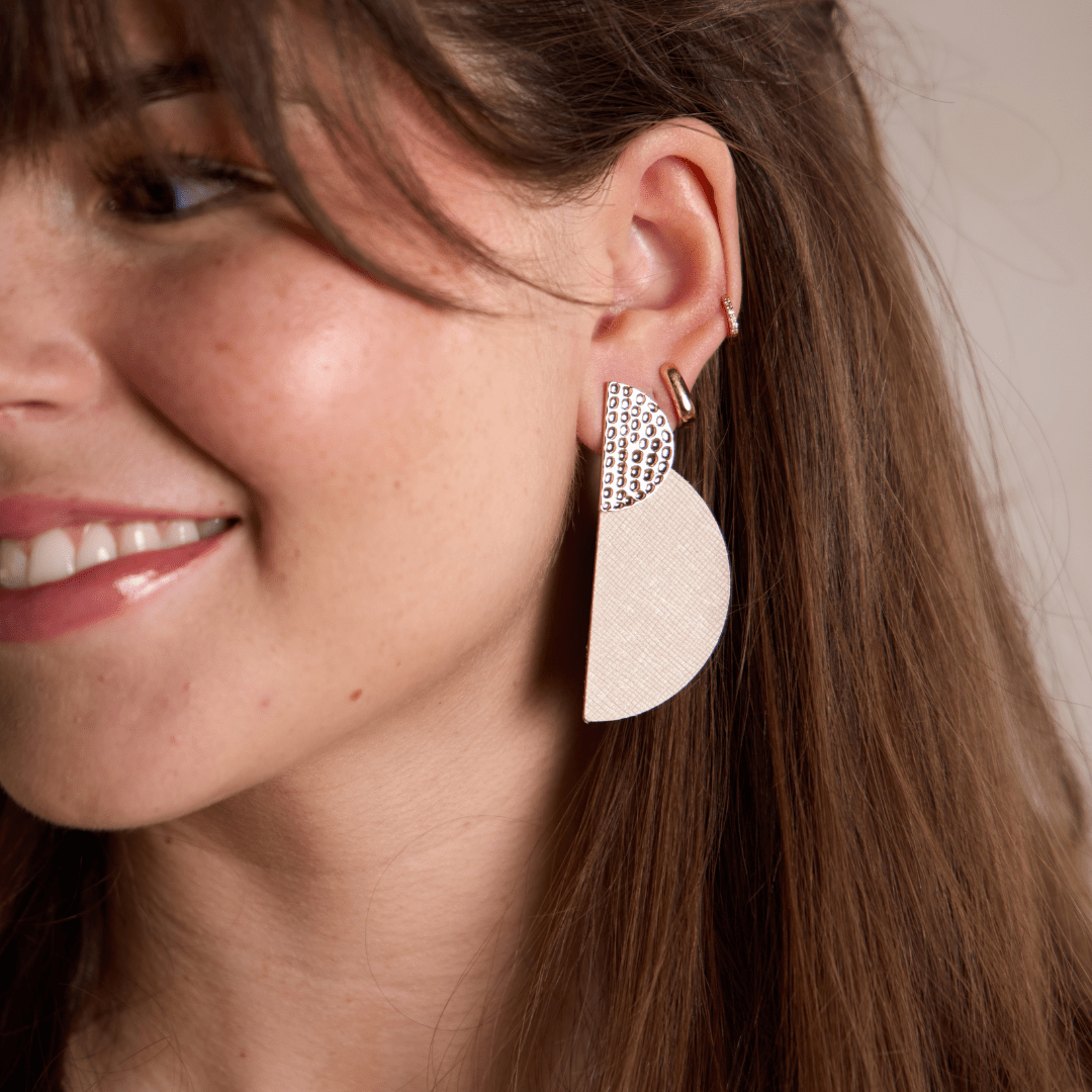 The Vanilla Shimmer Demi earrings embody a captivating blend of classic elegance and a fresh, modern aesthetic. ✨ Their soft, creamy hue, infused with a subtle shimmer, casts a radiant glow that beautifully elevates any ensemble. Expertly crafted from sumptuously lightweight leather, these earrings offer effortless comfort and sophisticated style for your everyday adventures. 🌿 Adorn yourself with this versatile pair that celebrates understated glamour and mindful design. 🌸