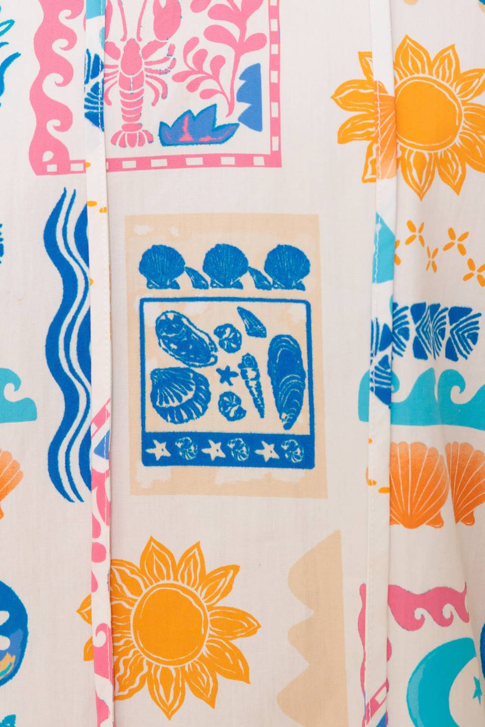 A printed woven top featuring ruffled neckline with front tie and double ruffled sleeve