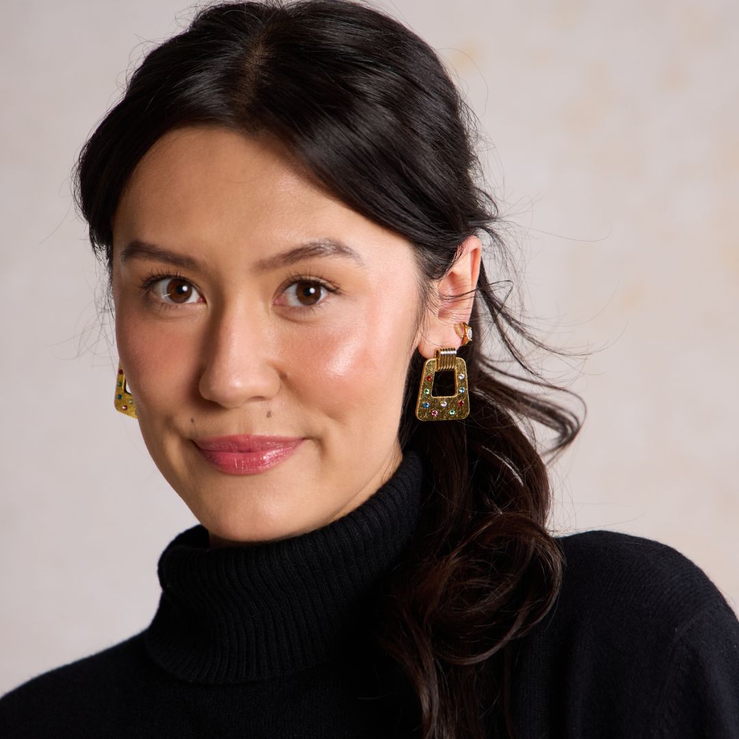 Embrace a touch of vintage allure with our Avery earrings, where timeless style beautifully merges with a modern silhouette. ✨ These lightweight statement earrings are lovingly crafted from our premium, firm Vintage Gold leather, adorned with delicate jeweled accents that catch the light. They feature an elegant beveled gold or silver stud component, ensuring comfort and radiant charm for any occasion. 🌿