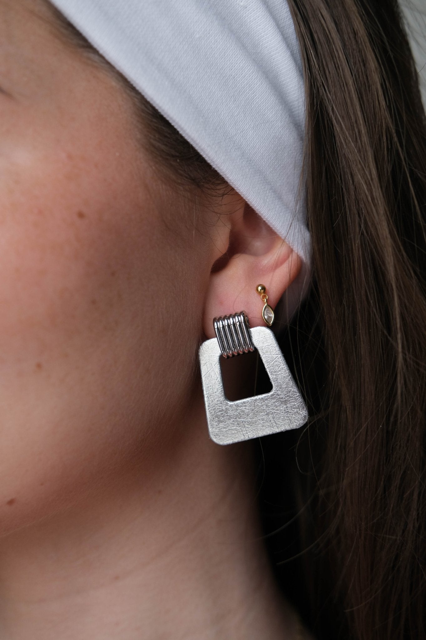 Adorn your ears with the timeless allure of the Avery earrings, where vintage charm beautifully melds with a sleek, modern silhouette. ✨ Crafted from our premium firm Vintage Silver leather, these lightweight statement earrings offer effortless elegance for any occasion. Each earring features a chic beveled silver stud component, adding a touch of refined sophistication to your look. 🌿 Enjoy the perfect blend of comfort and style with this exquisite accessory.