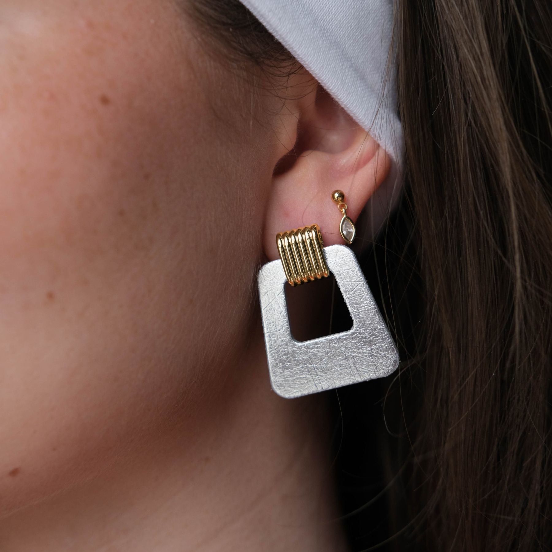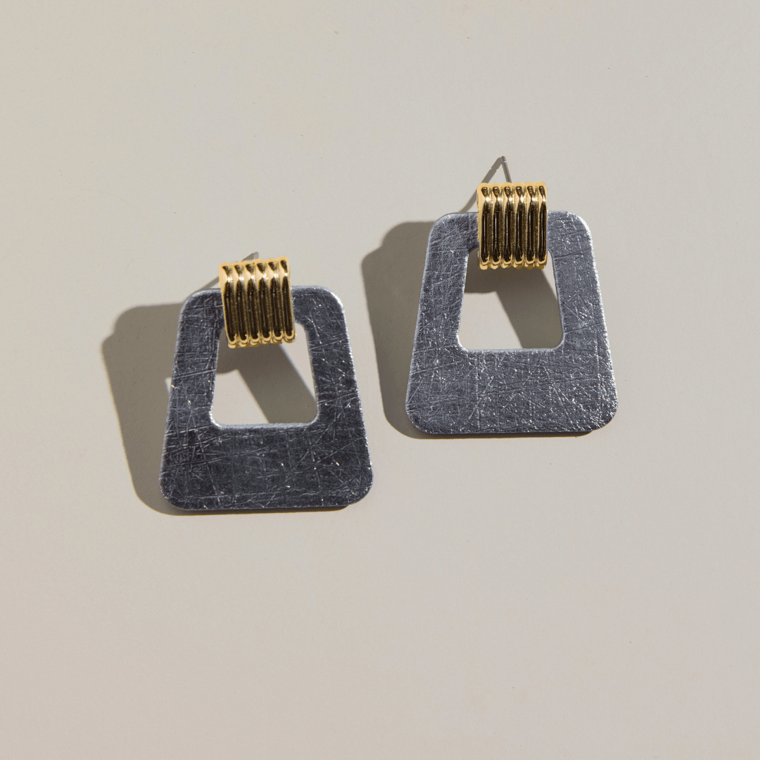 Embrace timeless elegance with the Avery earrings, where vintage charm meets a modern silhouette. ✨ Crafted from lightweight, premium Vintage Silver leather, these statement earrings offer effortless style for any occasion. A delicate beveled gold stud component adds a touch of sophisticated shimmer, making them a versatile accessory for your conscious wardrobe. 🌿