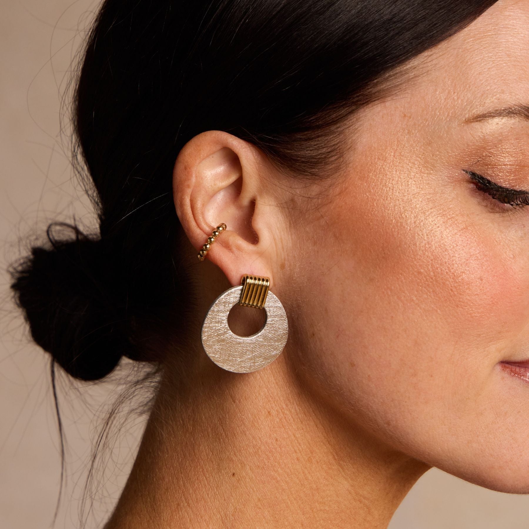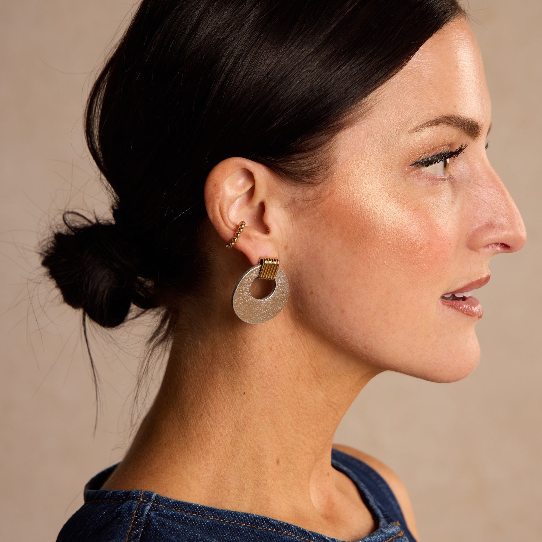 Embrace timeless style with the Mixed Metal Vintage Silver Evan, where a modern round silhouette meets bohemian elegance. ✨ These lightweight statement earrings feature exquisite Vintage Silver leather, beautifully complemented by a radiant gold beveled stud component for a touch of understated glamour. They are designed to add a sophisticated yet earthy sparkle to any ensemble, embodying the free-spirited essence of Boho Style Co. 🌸