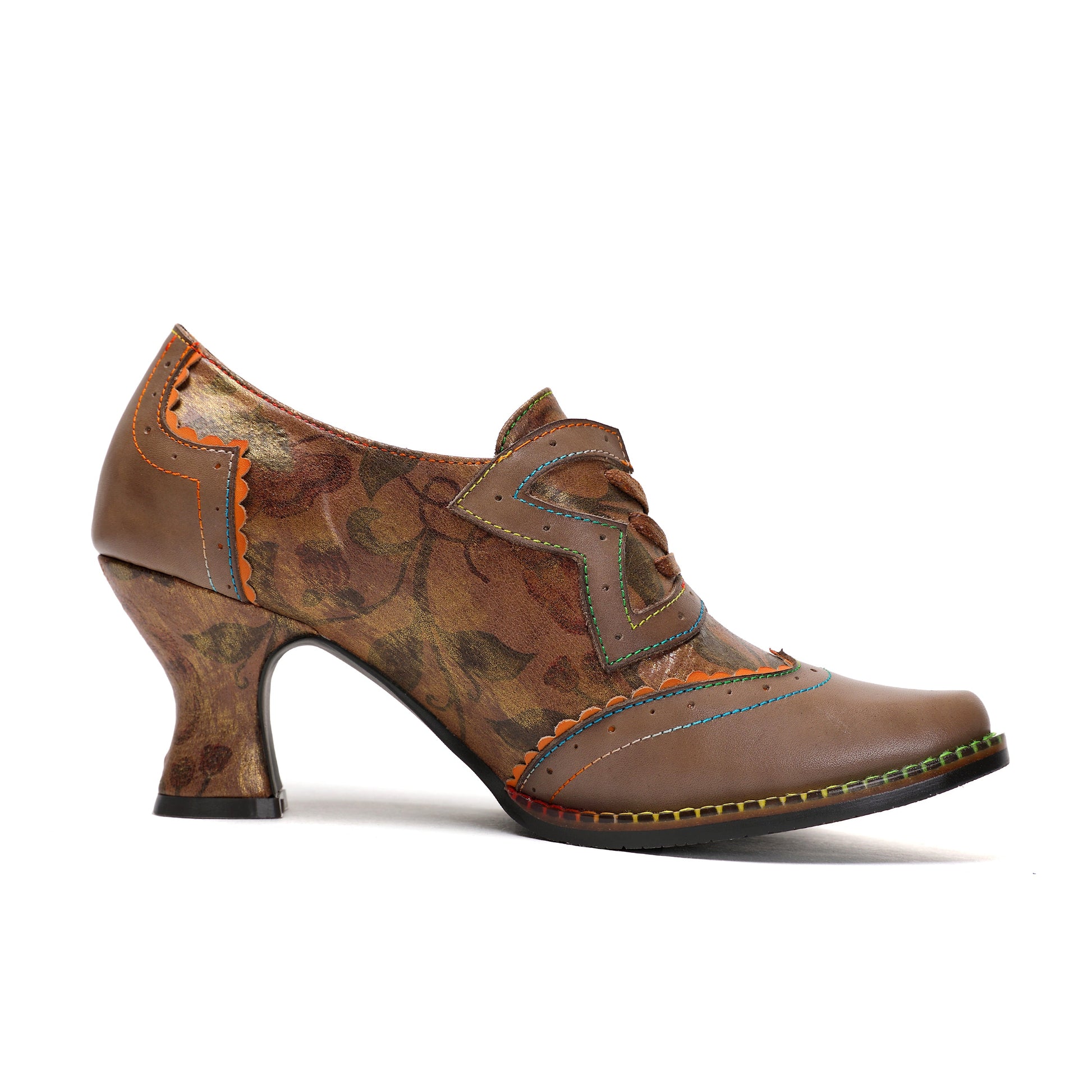 Vintage Inspired Floral Kitten Heel Round Toe Elegant Premium Leather Shoes