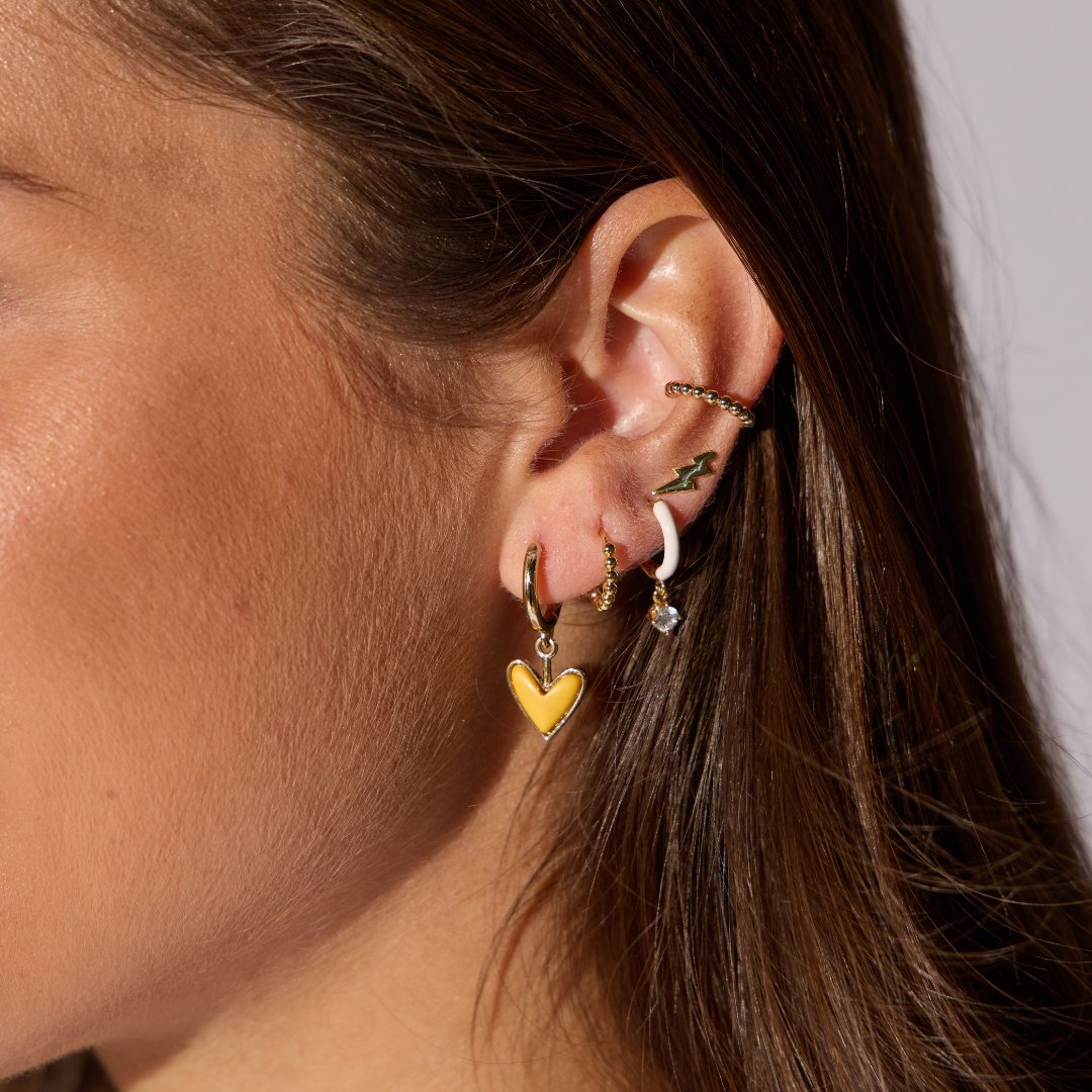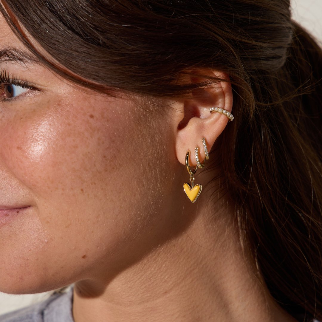 Adorn your ears with these charming Yellow Stone Sweetheart Huggies, perfect for adding a touch of sunshine to any ensemble. ✨ These petite, gold-plated hoops feature a beautifully vibrant yellow stone charm, crafted over brass, and secure with a comfortable hinged closure. Inspired by our beloved statement earrings, these huggies are ideal for effortless mixing and stacking to create your unique, free-spirited look. 🌿 Their on-trend appeal makes them a versatile accessory for everyday wear or special occasions.
